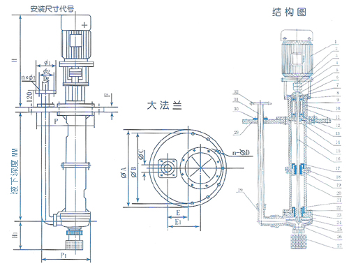 2、本泵特点是立式结构,泵体、叶轮部份浸没在液体中,故占用较小面积,轴封无泄漏现象,因而适用于输送腐蚀性液体。本泵可按防爆区域和非防爆区域选用,凡在防爆区域使用配置防焊型电机,这类电机分三种组级型号,当使用条件含各种爆炸性混合时,应选用最高组级。